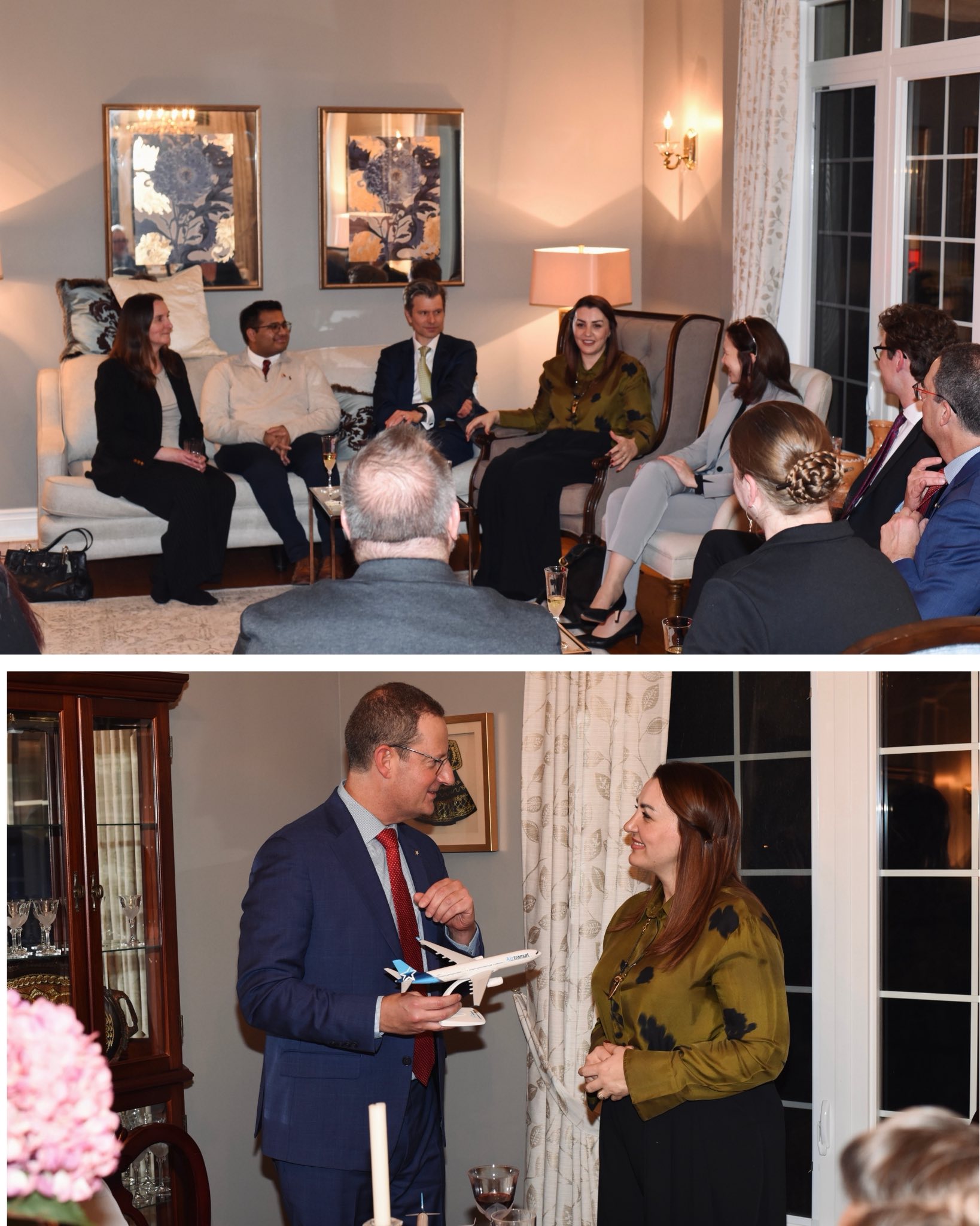 Ambasadorja e Republikës së Shqipërisë në Kanada, znj. Artemis Malo, mirëpriti, në rezidencë, ekipin e Ministrisë së Punëve të Jashtme të Kanadasë, për negocimin e Marrëveshjes së Bashkëpunimit ndërmjet Këshillit të Ministrave të Republikës së Shqipërisë dhe Qeverisë së Kanadasë në fushën e transportit ajror. Darka u zhvillua në një atmosferë konstruktive dhe miqësore, duke theksuar vullnetin e përbashkët për thellimin e bashkëpunimit dypalësh ndërmjet dy vendeve. Në këtë aktivitet ishte i pranishëm edhe përfaqësuesi i kompanisë Air Transat, z. Howard Liebman, Zëvendëspresident i kompanisë, pjesëmarrja e të cilit nënvizoi interesin konkret të sektorit privat për vijimin e zgjerimit të bashkëpunimit në këtë fushë me potencial të rëndësishëm ekonomik dhe turistik. Avioni Airbus A330, si një miniaturë simbolike, u dorëzua për të prezantuar avionin që do të kryejë fluturimin e parë historik. Ky hap përbën një zhvillim domethënës në avancimin e marrëdhënieve shqiptaro-kanadeze dhe krijimin e mundësive të reja për lëvizjen e qytetarëve, biznesit dhe turizmit ndërmjet Shqipërisë dhe Kanadasë.