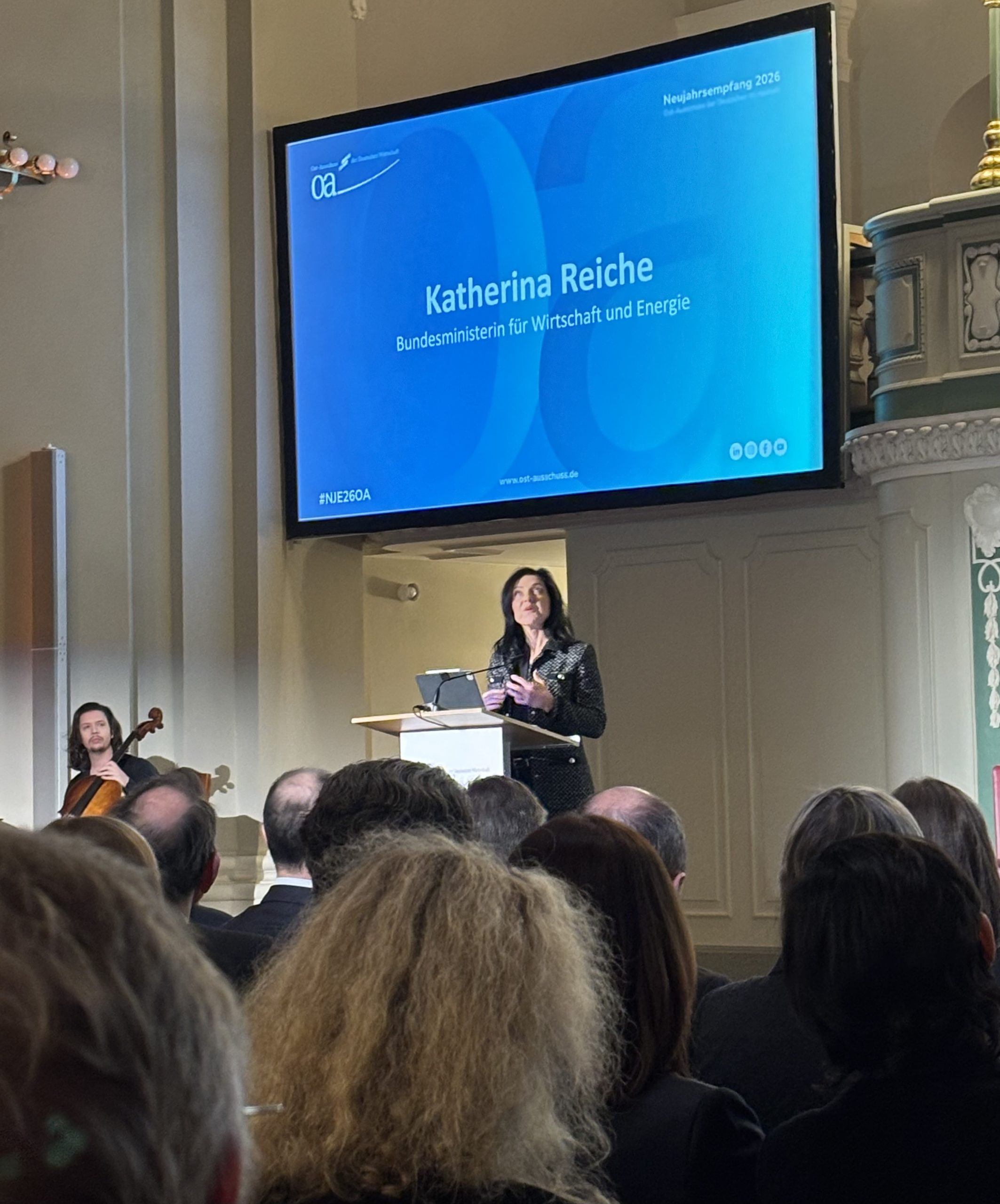 Takimi i Komitetit Lindor Gjerman Ost Ausschuss me rastin e vitit te ri 2026 u zhvillua në prani të Ministres Federale për Çështjet Ekonomike dhe Energjinë, znj. Katharina Reiche. Në fjalën e saj, Ministrja paraqiti objektivat ekonomike të Gjermanisë, të ndërthurura ngushtë me prioritetet politike, si edhe pritshmëritë për vitin 2026.
