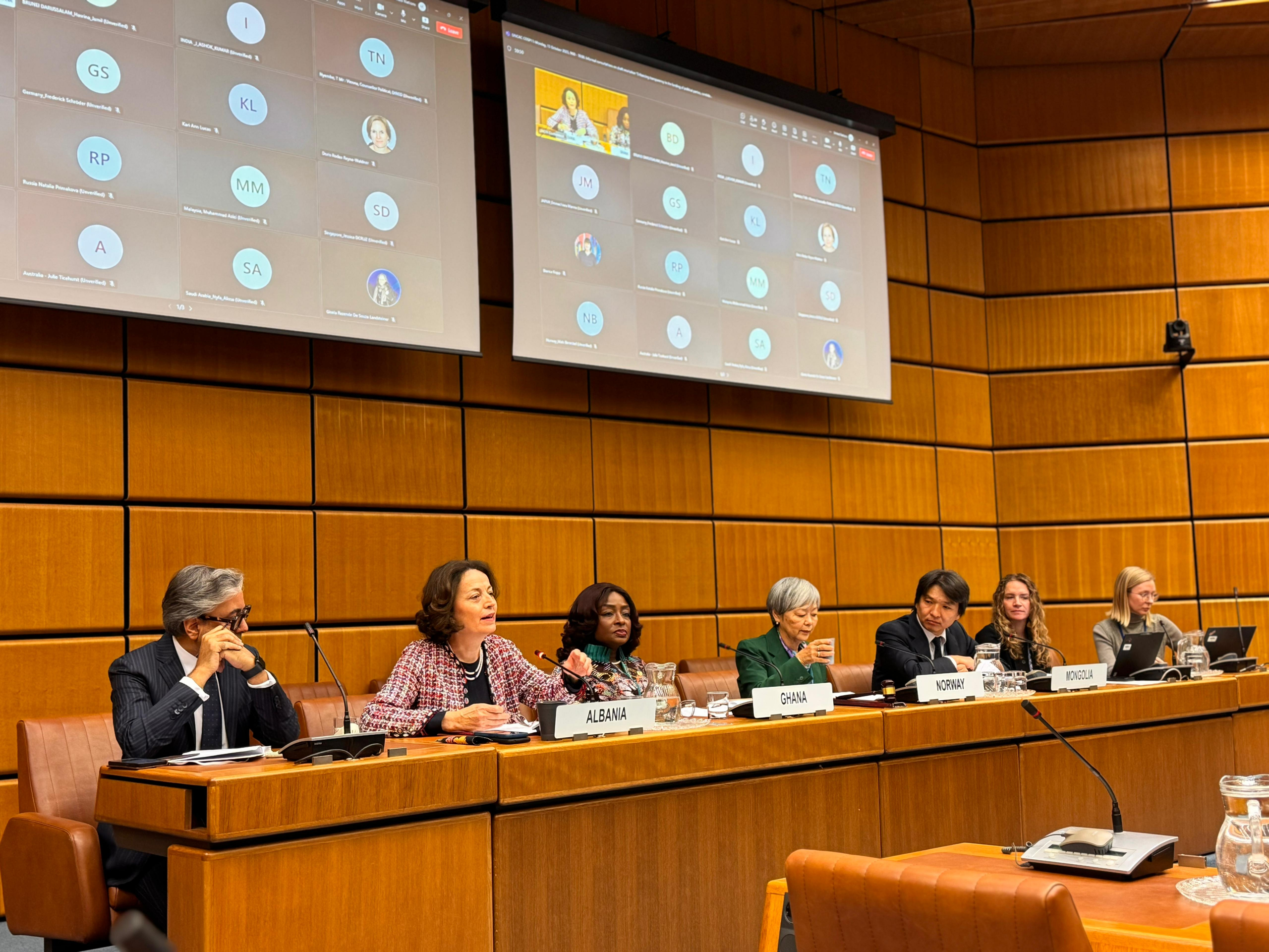 Vienna, 13 October 2025 — The Permanent Representatives of Albania, Ghana, Mongolia, and Norway today launched their joint draft resolution entitled “Enhancing transparency in the funding of political parties, candidatures for elected public office, and electoral campaigns” at the United Nations in Vienna.