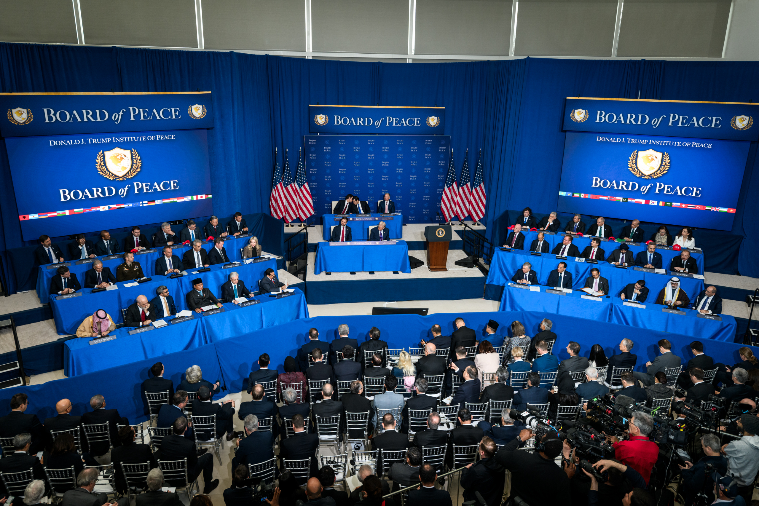 President Donald Trump participates in signing ceremony during the inaugural Board of Peace meeting at the Donald J. Trump Institute of Peace in Washington, D.C., Thursday, February 19, 2026. (Official White House Photo by Daniel Torok)